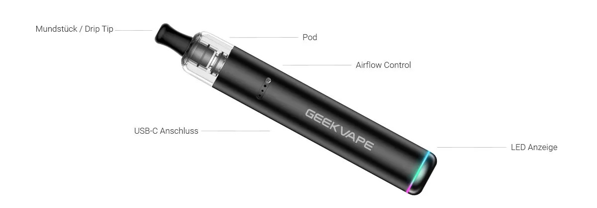 Für den Betrieb der WENAX S3 Evo aus dem Hause GeekVape stehen Ihnen im Adjustable Wattage-Modus drei verschiedene Leistungsstufen zur Verfügung. Drücken Sie die Feuertaste drei Mal in schneller Folge, um zwischen den unterschiedlichen Stufen zu wechseln. Arbeitet das Gerät auf der niedrigsten Leistungsstufe, so leuchtet der LED-Indikator rot. Blaues Leuchten des Indikators bestätigt die Auswahl des mittleren Leistungsniveaus. Betreiben Sie Ihre E-Zigarette auf dem höchsten Leistungslevel, so leuchtet der Indikator grün. Zusätzlich werden Sie dank des LED-Indikators über die Ladespannung des internen Akkus mit einer Kapazität von 1.100 mAh informiert. Leuchtet der Indikator während des Dampfens grün, so liegt die Ladespannung zwischen 100 und 70%. Blaues Leuchten bildet eine Restladespannung von 69 bis 31% ab. Fällt der Ladestand unter den Wert von 30%, so leuchtet der Indikator rot. Die Airflow Control der GeekVape WENAX S3 Evo ermöglicht es Ihnen, den Zugwiderstand der E-Zigarette Ihren persönlichen Präferenzen anzupassen. Über einen Schieberegler an der Seite des Devices kann sie stufenlos reguliert werden. Je weiter der Lufteinlass geschlossen wird, desto restriktiver fällt der Zugwiderstand aus.