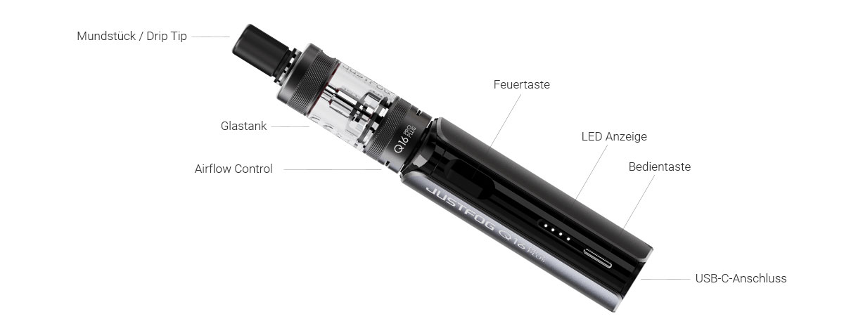 Das Q16 Pro Plus E-Zigaretten-Set von JustFog kombiniert den gleichnamigen Akku mit einer Kapazität von 1.500 mAh und bis zu 16 Watt Ausgangsleistung mit dem Q16 Pro Plus Clearomizer, der sich durch sein integriertes Top Filling-System, die stufenlos regelbare Airflow Control und ein Tankvolumen von 3 Millilitern auszeichnet. Bestandteil des Lieferumfangs ist zusätzlich ein geeigneter Verdampferkopf aus der Cotton-Serie von JustFog. Mit einem Widerstand von 1,6 Ohm ist dieser für das moderate Dampfen mit Zügen vom Mund zur Lunge optimiert. Die E-Zigarette wird über die Feuertaste in Kombination mit einer Einstelltaste gesteuert. Das Gerät arbeitet im Variable Voltage-Modus mit in vier Stufen regelbarer Ausgangsspannung. Ein integrierter LED-Indikator informiert Sie über die gewählte Spannungsstufe und eine weitere LED an der Oberseite des Mods gibt in drei Farbabstufungen Aufschluss über den Ladestand des internen Akkus. Über das zum Lieferumfang gehörende Type C-USB-Kabel kann dieser mit bis zu einem Ampere Ladestrom effizient mit frischer Energie versorgt werden. Clearomizer und Mod werden beim JustFog Q16 Pro Plus E-Zigaretten-Set über ein standardisiertes 510er Gewinde miteinander verbunden.