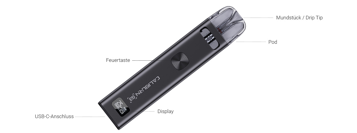 Die Caliburn G3 von UWELL ist eine E-Zigarette aus der Kategorie der Pod-Systeme mit einer Kapazität von 900 mAh. Beim Set trifft der gleichnamige Akku mit bis zu 25 Watt Ausgangsleistung auf den Caliburn G3 Pod mit einem Tankvolumen von 2,5 Millilitern. Der Lieferumfang des Sets umfasst zwei Cartridges mit integrierten Coils, welche mit unterschiedlichen Widerständen für verschiedene Zugtechniken optimiert sind. Während die 0,9 Ohm Cartridge das moderate Dampfen vom Mund zur Lunge unterstützt, ermöglicht der Caliburn G3 Pod mit 0,6 Ohm auch restriktive Züge direkt in die Lunge. Die UWELL Caliburn G3 arbeitet mit regelbarer Leistung und kann optional über die Feuertaste oder auf Zug am Mundstück aktiviert werden. Dank Ihres integrierten OLED-Displays behalten Sie vorgenommene Einstellungen und wichtige betriebliche Parameter des Devices zu jeder Zeit im Blick. Mit bis zu 2 Ampere Ladestrom kann der integrierte Akku über das mitgelieferte Type C-USB-Kabel beschleunigt und optimiert geladen werden. Die Cartridge wird bei der Caliburn G3 durch einfaches Zusammenstecken mit dem Housing des Akkus verbunden.