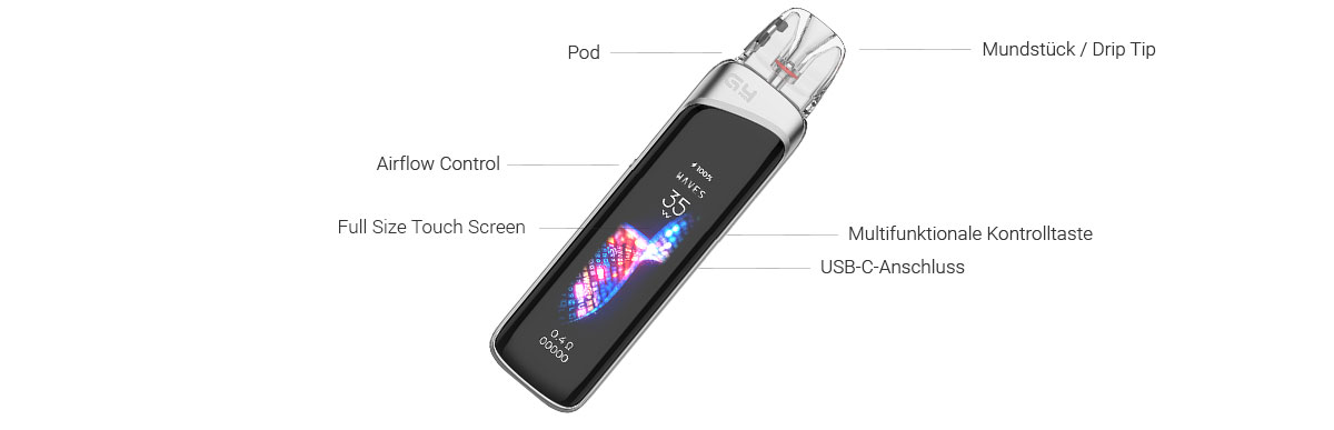 Der Caliburn G4 Pro Akku ist die zentrale Einheit des Sets und bietet eine integrierte Akkuzelle mit 1.800 mAh Kapazität sowie eine maximale Ausgangsleistung von 35 Watt. Mit Maßen von 120,7 x 30 x 18,8 mm und einem Gewicht von 78 Gramm verfügt das Gerät über ein 2,51 Zoll Farbdisplay mit Touchscreen-Funktionalität für die Steuerung. Die Benutzeroberfläche dieses Displays kann durch sechs verschiedene UI-Themen individuell gestaltet werden. Die Bedienung wird durch eine optionale Zugaktivierung ergänzt, sodass Nutzer zwischen Tasten- und Zugauslösung wählen können. Eine seitliche Airflow Control ermöglicht die stufenlose Anpassung des Zugwiderstands. Zusätzlich ist ein tropfenförmiges Sichtfenster am Akku integriert, das eine Kontrolle des Liquidstands im eingesetzten Pod ermöglicht. Der Akku wird über einen USB-C Anschluss mit DC 5V/2A geladen.